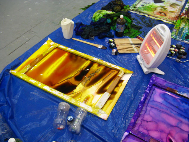 Met het ideaal mijn werkproces zo simpel mogelijk te houden, produceer ik schilderijen van verschillende formaten. Het dikke papier dat ik gebruik overspoel ik met veel inkt aquarelverf opgelost in water. Voor, tijdens of na het spelen met het vocht span ik het papier op een houten frame. Gedurende het droogproces laat ik de kleurpoelen met rust. Ik ambieer dit proces minstens 200 keer op deze wijze te herhalen, om zo de diversiteit van op deze manier gevormde beelden te ontdekken. |